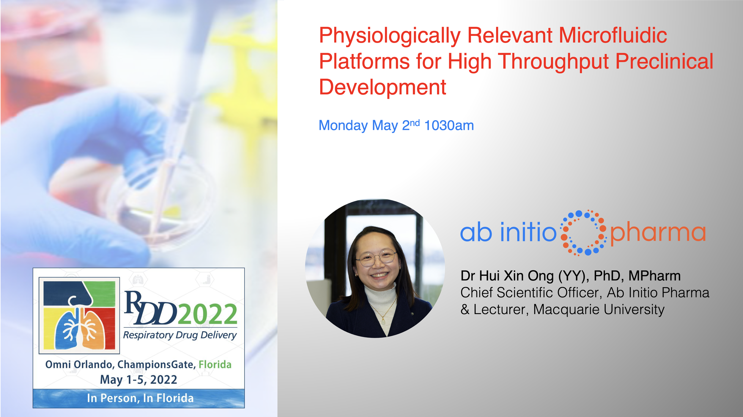 Dr Hui Xing Ong (YY), Ab Initio’s Chief Scientific Officer, will present on the podium at RDD2022. YY Will update you on recent advances in preclinical screening tools that can be used to evaluate the saftey, efficacy and pharmacokinetics of new medicines. Using these micro fluidic platforms, real inhalation formulations can be evaluated in real-time,. overcoming issues with traditional cell biology approaches. Join us in person, to listen to YY on the 2nd May at 1030am live from Orlando, Florida.