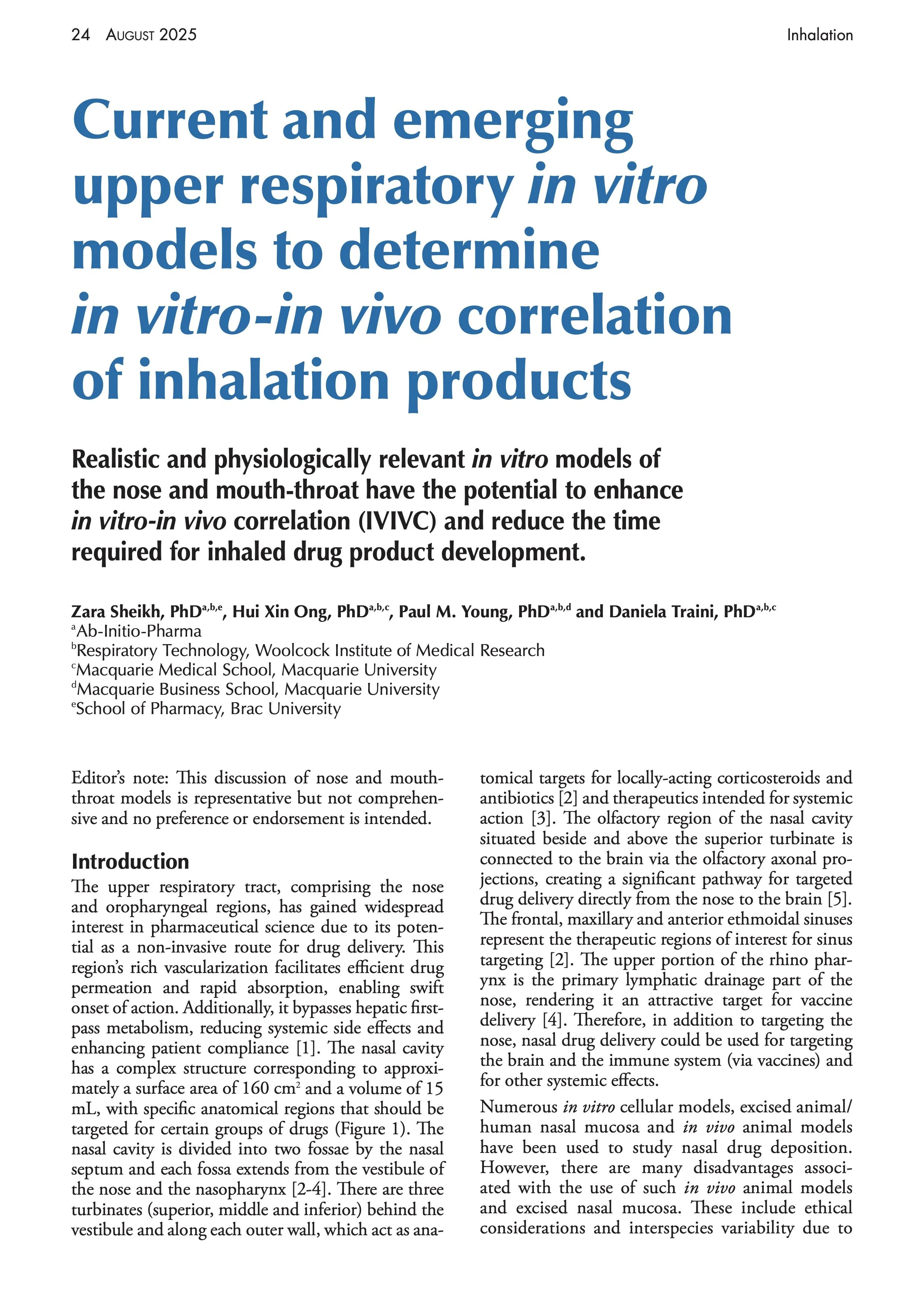 Ab Initio Pharma co‑authored a new feature in Inhalation (August 2025) on current and emerging in vitro models of the upper respiratory tract and how these tools can strengthen in vitro–in vivo correlation and accelerate development of inhaled products. Co‑authors are Dr Zara Sheikh, Dr Hui Xin Ong, Professor Daniela Traini, and Professor Paul M. Young.